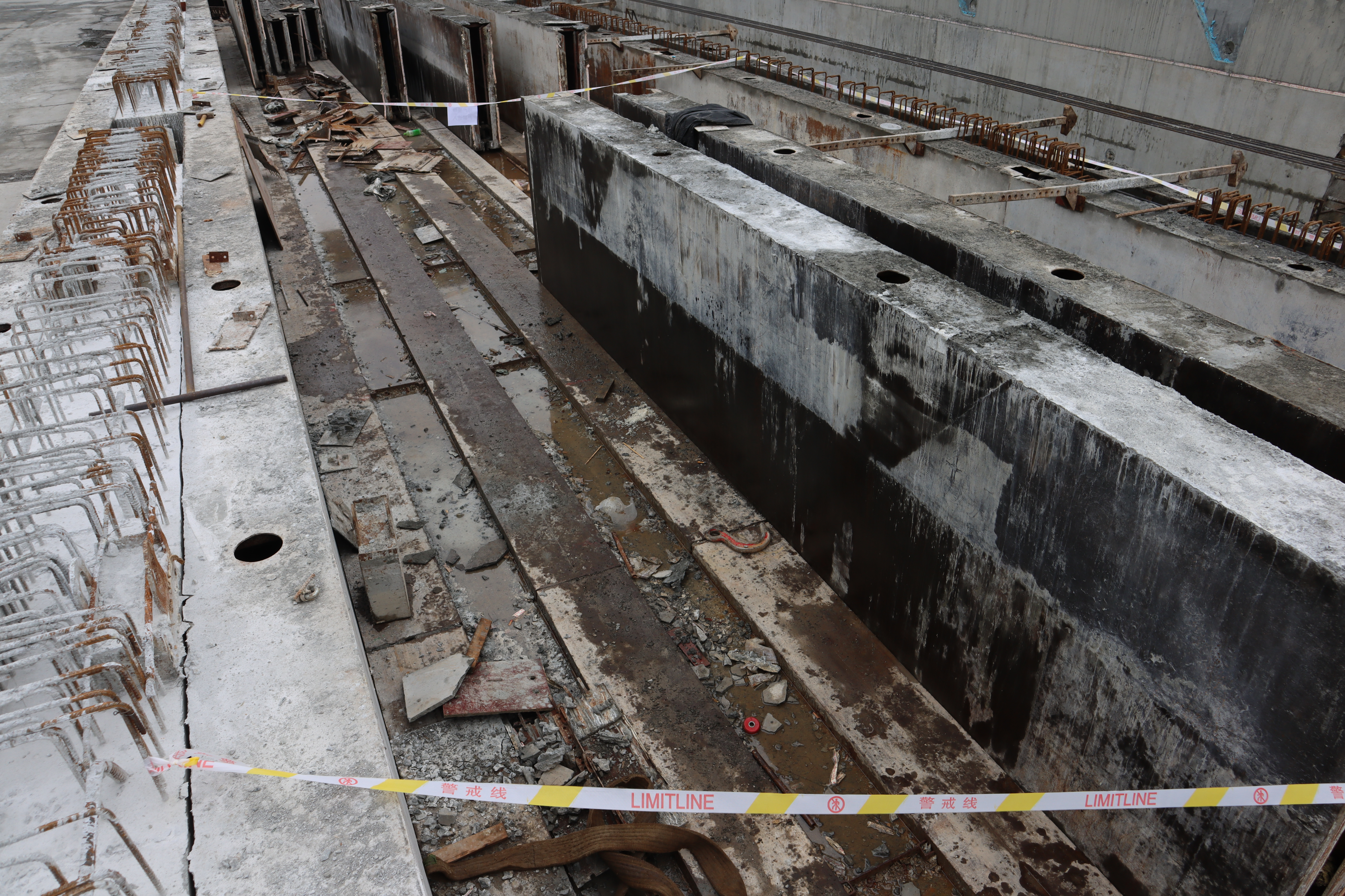 事故地点位于松江区新浜镇文超路88号7#预制梁生产场地西侧18号、17号生产线的中部区域,如下图所示,生产线沿南北向设置,每条生产线之间预留有若干条凹槽,凹槽宽约0.35米、深约0.05米,凹槽内竖立放置着若干模板,每块模板长6米、宽0.35米、高1.4米、重约1000斤,为铁质材料,场地北侧安装有一行车。